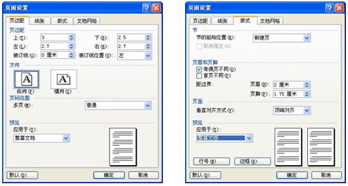 页面设置:上3厘米,下2.5厘米;左2.7厘米,右2.7厘米;页眉2厘米,页脚1.75厘米,页眉和页脚项选择“奇偶页不同”。
